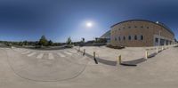 a 360 degree view of a skateboarder going down the ramp in front of a building