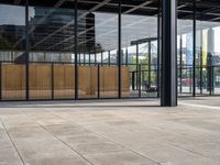 Skateboarder rides along the sidewalk outside a modern office building in Berlin's financial district. Glass walls reflect the urban landscape. A typical day in the heart of Europe's business hub.