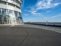 a skateboarder riding through a curved walkway near the ocean with a building on top