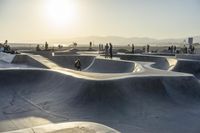 A skateboarder is seen riding at a skate park in Los Angeles, California. The park is located near the coastal area and offers a mix of concrete surfaces surrounded by sand and water. The open space and clear sky provide a perfect backdrop for outdoor recreational activities. In the distance, a mountain view can be seen, adding to the picturesque landscape. The skateboarder is one among many others who can be seen enjoying the sport under the sunny sky. This image captures the energy and excitement of skateboarding in the beautiful surroundings of Los Angeles skate parks like Santa Monica and Venice Beach.