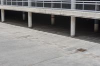 This stock photo showcases a skateboarder skillfully riding underneath an overpass in the bustling city of Toronto, Ontario, Canada. The skateboarder is seen outside a building, gliding on the smooth asphalt road surface. The composition captures the architectural elements of the overpass and the urban furniture on the elevated road. The grey sky sets a moody atmosphere, adding to the overall urban vibe of the image. The image reflects an open space straight down the road, highlighting the high, concrete walls and guard rails. The blend of composite materials, including cement and concrete flooring, creates an intriguing visual profile. This dynamic shot is perfect for illustrating urban lifestyle, architecture, and city life in Canada.