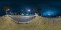 A skateboarder glides down an elevated cement slope in San Francisco at night. The city skyline is illuminated, with the iconic Golden Gate Bridge in the distance. The dark atmosphere adds to the midnight adventure.