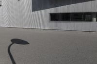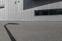 This captivating stock photo features the shadow of a person riding on a skateboard amidst the urban landscape of Toronto, Canada. The black-and-white image showcases a stylish composition, with a metal wall and a large window in the background. The sleek skateboard glides across the asphalt road surface, contrasting with the grey shades of the city. The modern architecture of the office building adds an element of urban design to this bustling business district. The photograph captures the dynamic energy of a day in the city, showcasing the convergence of business and leisure in Toronto's open spaces.