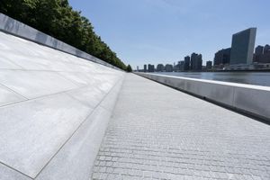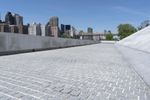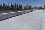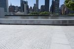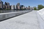 Skateboarder practicing tricks on the wall of a skate park in New York City. The urban cityscape and clear sky provide the perfect backdrop for this high-energy activity.