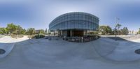 skateboarders are riding down a concrete ramp on their boards in front of an office building
