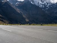 a skateboarder is riding down the road in front of snow - capped mountains