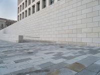 A person skateboarding in front of modern architecture in Berlin. Buildings with brick walls provide a backdrop for urban design. The grey asphalt road surface contrasts with clear sky during the dawn of a city life.