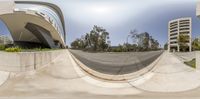 Skateboarder performing tricks on a half pipe in front of a modern office building in California's business district. Clear sky casts hard shadows on the concrete surface. The urban design reflects the city's vibrant energy.