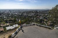 A person skateboarding uphill in California's Los Angeles, with a sprawling cityscape visible from the mountain peak. The modern architecture and residential areas create a dynamic city life. Surfaces range from asphalt roads to elevated handrails. A top-down overview of urban design.