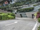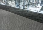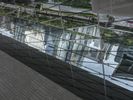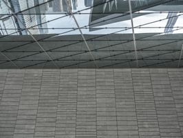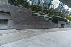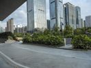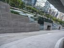 A skateboarder glides through the urban landscape, capturing the modern architecture of the city. The 360-effect photography adds depth to the scene, showcasing the high-rise buildings, glass walls, and concrete streets.