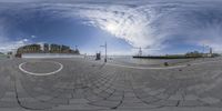 the panorama lens shows a man riding on skateboard at an intersection of a city plaza