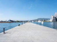 This stock photo captures a daring man straight down the road, riding a skateboard on top of a concrete platform that extends over the water. In the distance, a building can be seen, creating a picturesque scene. The location of this shot is in Kaohsuing, a city in Taiwan known for its harbor and coastal beauty. The image showcases the coastal charm of Kaohsuing, highlighting the coastline and the jetty that leads to the water. The blue sky and fluffy clouds add to the peaceful ambiance. This photo represents the beauty and dynamic energy of Asia, particularly the Republic of China, and is perfect for illustrating any project related to skateboarding, coastal destinations, or travel in Asia.
