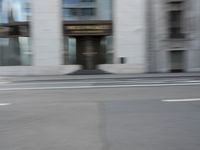 A man rides his skateboard down the sidewalk in Cologne, Germany. Blurry photo captures the motion blur and energy of the city. Classic architecture serves as a backdrop for the urban scene.