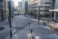 A man skateboarding down a high road in Denver, Colorado. Modern architecture surrounds the urban neighborhood, contrasting with the clear blue sky. Elevated concrete streets and steps embody the city's metropolitan design.