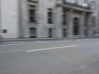 A man on a skateboard is speeding down the road in motion, with a blurred building in the background. The vibrant city of Cologne, Germany, is visible with its classic architecture and urban atmosphere. The asphalt road, lined with structures and surrounded by public space, adds to the dynamic and energetic atmosphere of the day. The motion blur adds a sense of speed and movement to the image, capturing the thrill of skateboarding in an urban setting.
