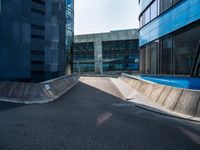 A person riding a skate board up a ramp down a sidewalk towards a building in a bustling city. The modern architecture of the buildings, with their glass windows reflecting the blue sky, creates a captivating urban design. The road surface, made of asphalt, blends seamlessly with the surroundings, enhancing the city's contemporary feel. This vibrant cityscape captures the essence of city life in Holland, Netherlands, a lively and diverse residential area. The building featured in the photo is a condominium, showcasing the beauty of composite materials and facades in urban real estate. The photo showcases the perfect blend of urban design, architecture, and business district, making it an ideal representation of modern city life in Europe.