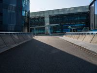 a man riding a skateboard on the pavement of an empty street past large glass buildings