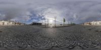 this is a fisheye lens photo of a person riding his skateboard on an empty street