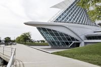 People are seen enjoying a beautiful day in Milwaukee, USA. They are riding on a skateboard past a building with a curved roof that has large windows. The modern architecture of the building is an impressive sight. The city's vibrant urban design is visible in the surrounding high-rise buildings and corporate headquarters. The walkway along the river, the tourist attractions, and the convention center add to the charm of this popular tourist destination in Wisconsin. The image captures the dynamic energy of the city and its futuristic architecture, creating a perfect representation of urban life in Milwaukee.