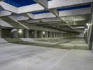 Skateboarder jumping into a massive tunnel in a metropolitan area. The camera captures a straight down view, showcasing the modern architecture of the tunnel and the surrounding cityscape. Artificial and natural light create a striking contrast.
