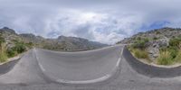 A man skateboarding down a mountain road in Spain, with stunning coastal views and clouds passing by. The highland landscape and rugged terrain create a thrilling ride. Experience the beauty of Spain on this adventurous road trip.
