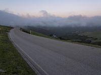 This stock photo showcases a man riding a skateboard down the middle of a scenic rural road in California during the evening. The image captures the beauty of the dusk sky with a blend of vibrant colors. The picturesque landscape features lush green hills, majestic mountains, and a foggy ambiance. The road, made of smooth asphalt, leads through a highland area, providing a captivating journey for adventure seekers. The elevated position of the road offers a breathtaking view of the surrounding mountain range. The image portrays a sense of freedom, thrill, and connection with nature.