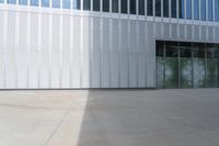 A man skateboarding outside a modern office building in Shanghai's bustling business district. The urban design features concrete and metal walls, with grey pavers on the surface. Hard shadows create a composite material property.