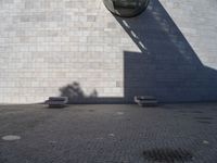 A person rides a skateboard on top of a stone block floor next to a white wall in Lisbon, Portugal. The grey cobblestone surface provides a smooth road for skateboarding. The modern architecture and sandstone wall create a stunning backdrop for this outdoor open space. With its hard shadows and tints of light, this image captures the dynamic energy of skateboarding in the city.