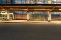 a person on a skateboard in front of an empty building at night with the light shining brightly