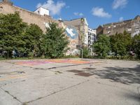 A skateboarder is standing on his board in a big empty parking lot in Berlin, Germany. The city's urban design is showcased with concrete surfaces and graffiti-covered walls. The courtyard provides an open space for activities like skateboarding and basketball. The clear sky above adds to the vibrant atmosphere of this urban art district in Europe. The rugged Hinterhof setting creates a unique backdrop for this thrilling sport.