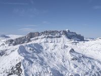 A breathtaking winter landscape photo featuring a skier standing on top of a snowy mountain side at Mont Blanc, Chamonix in France. The picturesque view showcases the magnificent mountain range, with open spaces and cliffs surrounding the area. The glacial beauty of the Alps is accentuated by the clear sky and contrails in the distance. This tourist attraction offers a perfect overview of the stunning massif, making it a must-visit destination for nature and ski enthusiasts.
