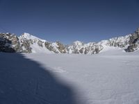 This stock photo features a skier skiing through the snow in the mountains of Italy. The picturesque landscape includes boulders, clouds in the clear sky, and a stunning view of the mountain range. The skier can be seen gliding down a slope with the beautiful snow-covered cliffs and the glacier in the background. It is a perfect tourist attraction for winter sports enthusiasts seeking adventure in the Alps of Italy. The image also captures the hard shadows created by the sunlight, adding depth to the overall composition. This photo offers an overview of the scenic beauty and natural splendor that attracts tourists to this region of Europe.