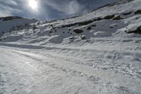 A person skiing up a snowy slope in the European highlands. The sun shines brightly, casting shadows on the glacial terrain. A small cave is visible in the distance, offering a cozy retreat.
