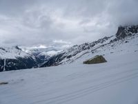 a person skiing down a snow covered slope with mountains in the background with clouds and rocks