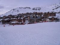 A breathtaking view of the French Alps at dawn. Snow-covered mountain ranges create an open space for skiing and tourism. Ski tracks and buildings dot the landscape, providing a clear indication of the popular tourist attraction. Europe's winter wonderland.