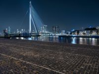 This is an image of a cityscape in Holland, Netherlands at night. The modern architecture of the skyscrapers is illuminated by street lights and artificial light, creating a stunning cityscape. In the foreground, there is a lake reflecting the lights of the buildings. The clear sky above adds to the beauty of the scene. The cobble stone road surface adds to the charm and history of the urban design. This photo captures the essence of city life in Europe, showcasing the combination of modern architecture and rich cultural heritage.