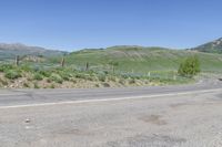 Slate River Road in Crested Butte, Colorado. The asphalt road winds through picturesque landscapes of mountains, grassy plains, and tall trees. A fence runs parallel to the road surface, marking the land lot. Clear skies complement the natural beauty of the day.