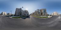 A quiet street in Toronto's modern residential neighborhood. The clear sky illuminates the sleek facade of the apartment buildings. Well-maintained walkways and road surfaces create a seamless urban design. This is city life at its finest.