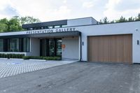 A modern residential building in Toronto's business district. The sleek architecture and large windows showcase the city's urban landscape. The building features a garage door and a spacious driveway for easy parking. Surrounding vegetation adds a touch of nature.