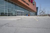 A modern office building and storefronts in the business district of Toronto, Ontario, Canada. The clear sky highlights the sleek architecture and clean lines. The urban landscape features roads, parking, and transportation options.