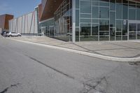 Modern architecture in the heart of Toronto, Ontario. A long building with glass doors and a sleek facade stands alongside a busy city street. The clear sky highlights the vibrant business district.