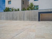 A modern architecture office building in Spain. The concrete wall and paver surface create a sleek and urban look. Clear sky and clouds add a dramatic touch to the business district. A perfect day in Europe's bustling city center.