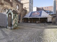 This stock photo showcases a small outdoor market with stalls set up in front of a charming brick building in Berlin, Germany. The market is located in a lively neighborhood, adding to the vibrant city atmosphere. A clock on the wall indicates the time of day, which is a sunny day with clear skies. The market is set up on a road lined with trees, creating an open and inviting space for visitors to explore. The brick facade of the building and cobblestone road surface add to the historic architecture and charm of the town. The market also features a courtyard and urban garden, providing a pleasant retreat for locals and tourists alike. Surrounding the market are arcades, cafes, and restaurants, offering a range of dining options. This photo captures the essence of city life and urban design in Berlin, making it a great visual for travel or vacation-related content. The classic architecture and European charm are sure to attract attention and evoke a desire for a memorable visit to this vibrant city.