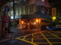 This stock photo features a small restaurant located on a city street at nighttime. The restaurant is illuminated by yellow lights, creating a warm and inviting atmosphere. The street is adorned with parked cars and a crosswalk can be seen nearby. The urban environment is captured, showcasing the architecture and city life. This image is perfect for illustrating the hustle and bustle of a city, the vibrancy of its nightlife, and the diverse dining experiences it offers.
