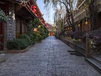 A picturesque scene of a small road in Lijiang, Yunnan, China. Classic and historic architecture line the cobblestone street, creating a charming atmosphere. Shops and storefronts offer glimpses into city life.