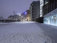 This image captures a snow-covered walkway along the waterfront at night. The snowy road surface reflects the glow of street lights, creating a serene atmosphere. In the background, buildings are visible, their windows lit up to contrast with the freezing darkness outside. This photo showcases a neighborhood transformed by winter, with the water adding an extra touch of beauty to the scene.