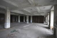 an empty building has many graffiti on the floor and the walls all have windows inside