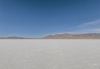 lone motorbike on a snow covered desert surface near mountains and sky line in distance