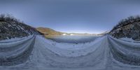three snow covered hills overlook an alpine lake and mountains in the distance near a sandy shore