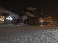 This captivating stock photo features a picturesque scene of a hotel on a snow-covered street at night in France. The entire area is blanketed in snow, creating a magical winter wonderland. The hotel's windows are illuminated, casting a warm glow onto the surrounding landscape. The dark night sky is adorned with clouds, adding to the enchanting atmosphere. This image perfectly captures the essence of winter tourism in France, making it an ideal choice for travel brochures, websites, and advertisements.